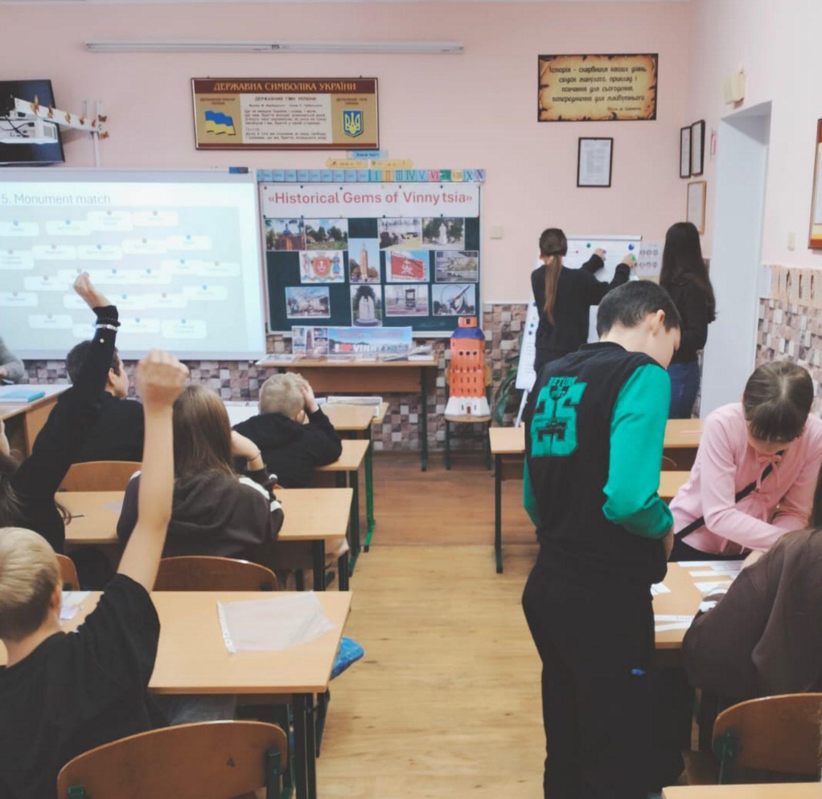 - вчителями англійської мови Н. Климчук та історії А. Медун проведено бінарний позакласний захід "Історичні пам'ятки Вінниці", під час якого учні 6-х класів в цікавій формі працювали над розвитком ключових компетенцій спілкування державною мовою, іноземною мовою, громадянською та соціальною, інноваційністю, формували почуття патріотизму;