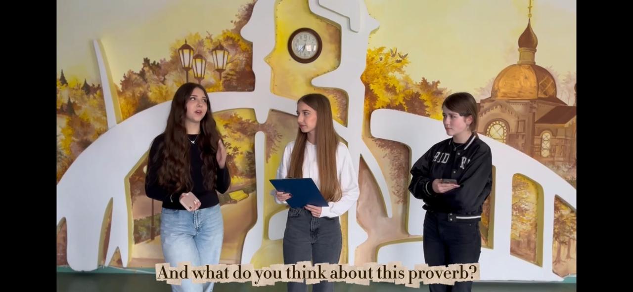 - під час демонстрації відео ролика - інтерв'ю з учнями нашого ліцею, який організували здобувачі освіти 11 класу та В. Антонова, діти ділилися своїми думками щодо значення англійського прислів'я "East or west, home is best!"