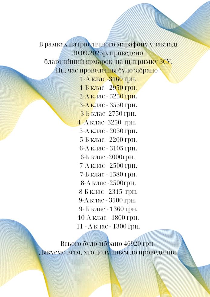 "Допоможемо захисникам!"- під таким гаслом 30.09.2025р. проведено благодійний ярмарок в рамках патріотичного марафону. Учнівські та батьківські колективи активно долучилися до заходу. Заздалегідь старанно готувалися: випікали різні смаколики та виготовляли власні вироби. Всього зібрано 46920 грн. За виручені кошти буде придбане все необхідне для наших військових.